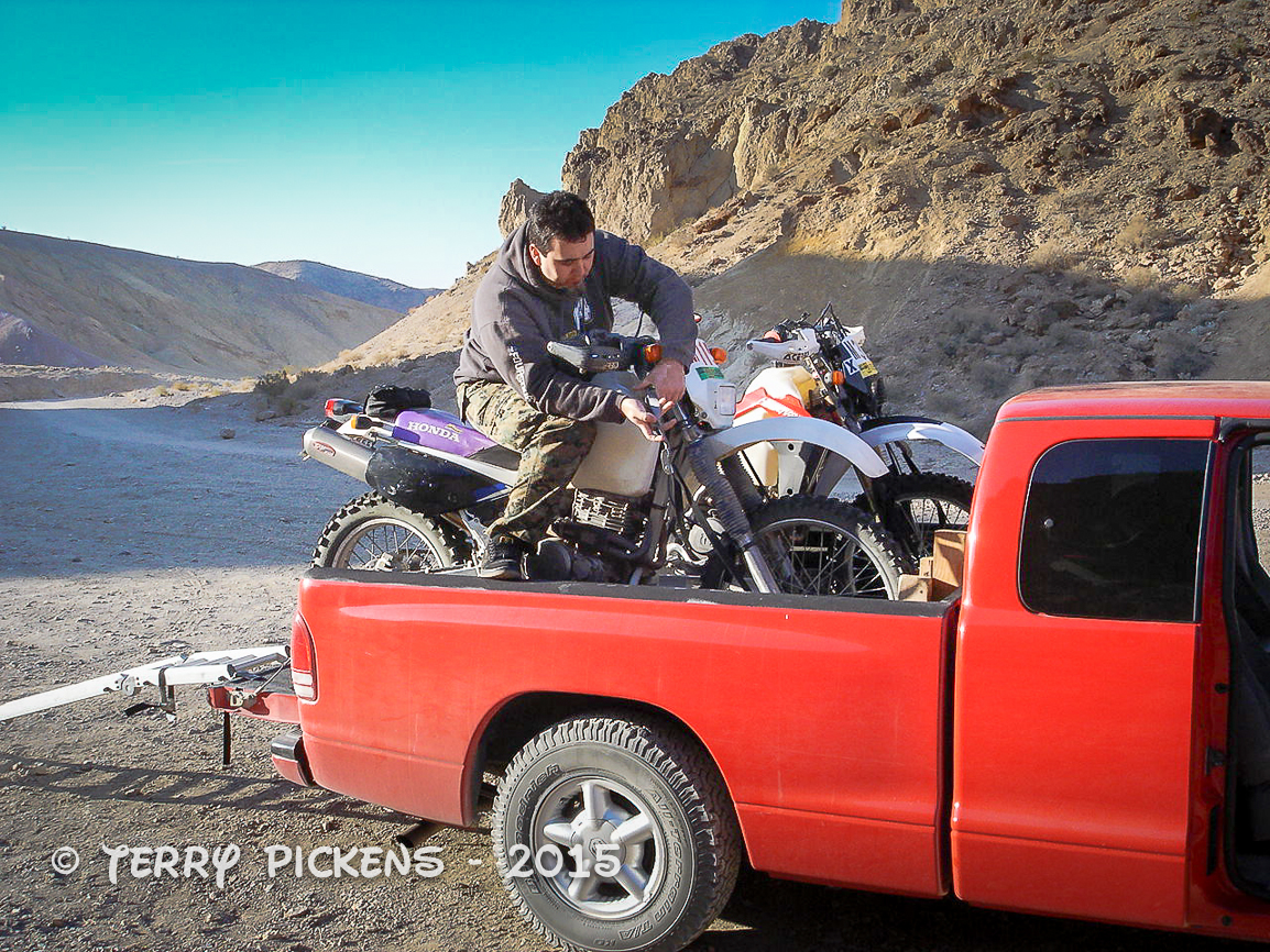 We left before sunrise for the 2-½ hour drive to our starting point located on Mule Canyon Road. We got there as the sun was breaking over the mountains and started to unload. Shaun would be riding my licensed Honda XR600R and I would be on my licensed race bike a Husqvarna 250.