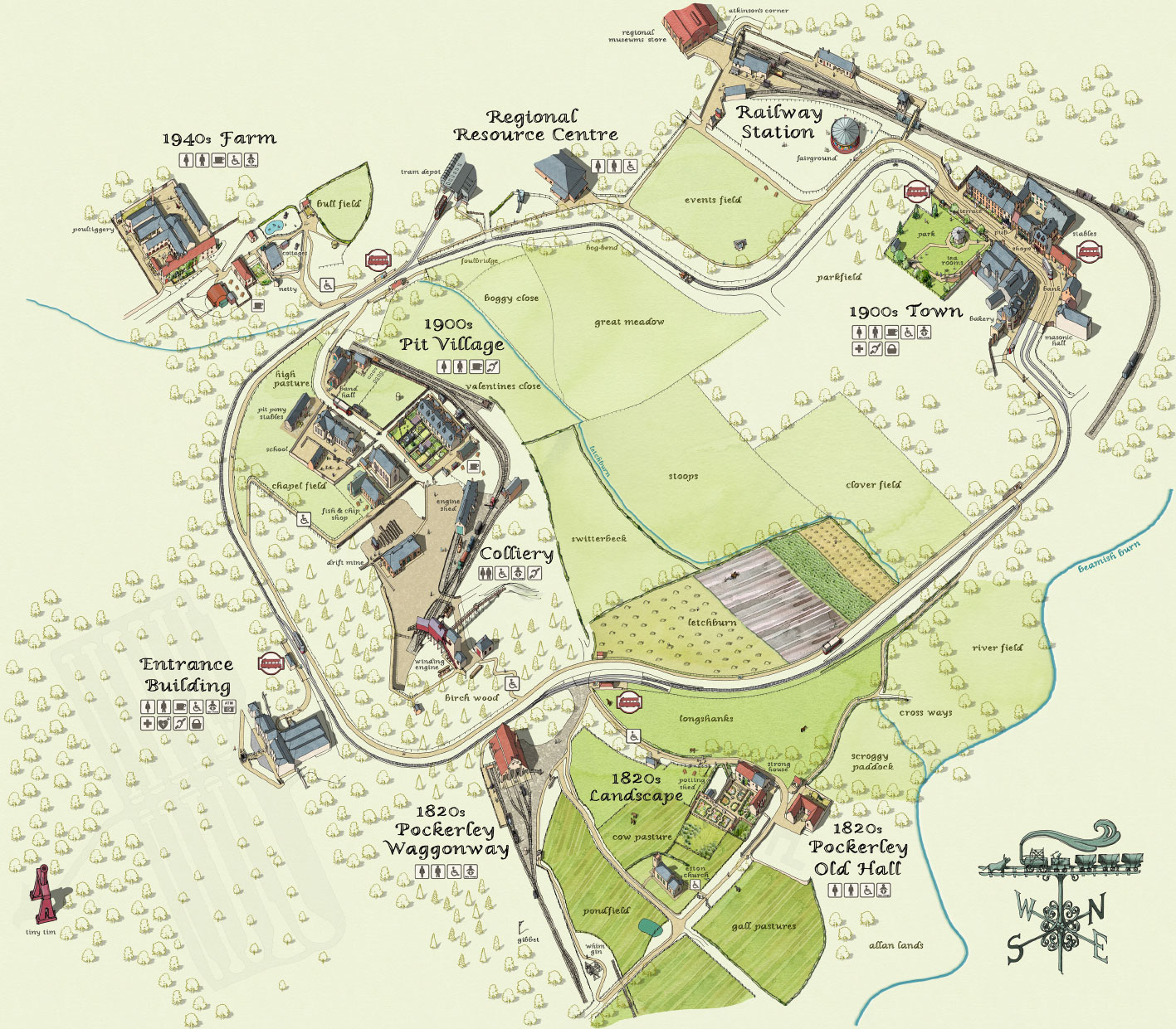The museum consists of 6 areas depicting an 1820’s Landscape, a 1900’s town with Railway Station, a 1900’s Pit Village with a 1900’s Coffiery (coal mining town and mine) and a 1940’s Farm. Making your way counterclockwise around the museum will take you from the 1820’s thru the 1940’s. The Tramway around the site is 1.5 miles long and it is said it will take about 20 minutes to walk from the entrance to the Town, although I can not confirm that with all the stops I took along the way.